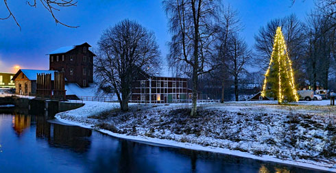 Bild 6. Årets julgran och i bakgrunden Olofsfors bruk och kvarnen.