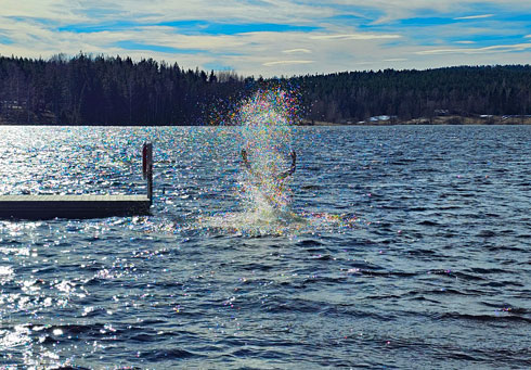 Bild 1. Ett uppfriskande påskbad i 0-gradigt vatten, strax söder om Hudiksvall där isen börjar ge vika på sjöarna.