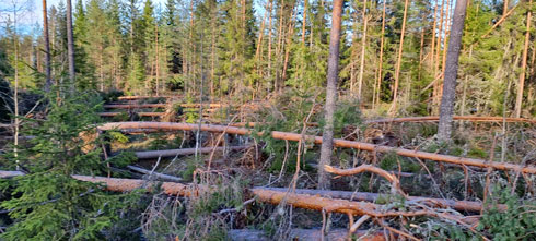 Bild 2. Johannes framfart i södra Norrland är betydligt värre än i Hörneå-skogen. Mången fin tall har blåst ned i stormen, här söder om Ockelbo. Man känner sorg och medlidande för skogskollegor söderut.