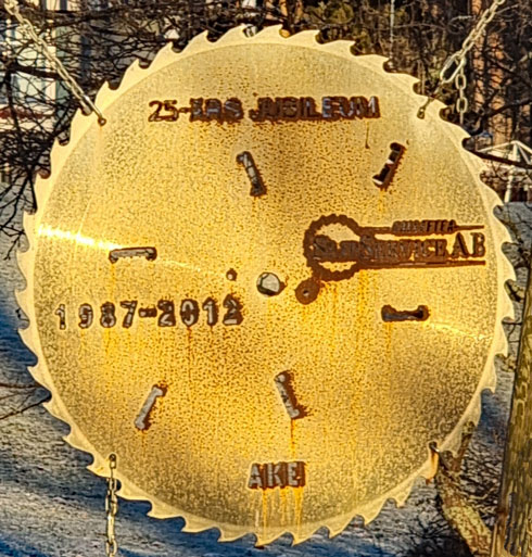 Bild 2. En sågklinga vid uppfarten till Sollefteå Slipservice. Förr satt även en sågklinga utmed väg 335, men den kanske inte uppfyllde Trafikverkets regler. Monumentet lutar betänkligt, men verksamheten i övrigt verkar stå på stadig grund.