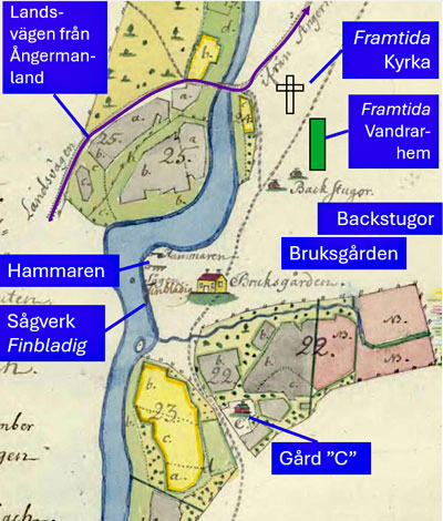 Bild 3. Jean Malmströms karta 1778. Uppe till höger har platser för den kommande Brukskyrka och "Statarlängan" markerats, dagens vandrarhem. "Landsvägen från Ångermanland" tillkom på 1600-talet, markerad lila. Övriga vägar är prickade.