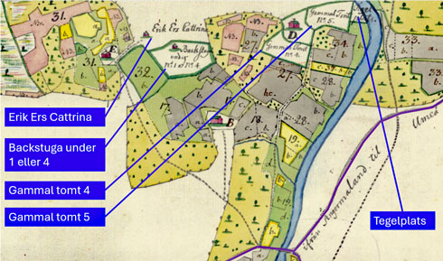I mitten av kartan 1842 (bild 5) återfinns "Jan Pärs" (Pärsson?). Denna gård är littererad "A", vilket antyder att den sammanförts med skattehemmanet "Gamgården" (bild 7). Men, år 1778 var samma gård ett kronohemman littererat "D" som beboddes (arrenderades) av Johan Pärsson. Uttrycket "Jan Pärs" 1842 kan syfta på Johan Pärsson 1778.