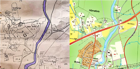 Järnbruket i bild 2 var nyligen etablerat då lantmätare Jean Malmströms 1778 upprättade kartan i bild 3 inför kommande Storskifte i byarna Hörne och Bäcken.