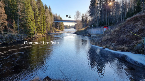 Till höger i bild 1 ses utloppet till kraftverket. Detta utlopp är sentida, medan utloppet från det äldre kraftverket (se bilder 3-4, ej i bruk idag) ses i nedre högra hörnet. Utmed åbrinken till höger finns en kvarvarande serpentinväg. På vänster sida (nordöst) ses rester av ett gammalt brofäste eller fundament. Högre upp på bergskanten ansluter en väg, ungefär 20 meter över vattenytan. En bro på denna plats torde ha varit en hög och utmanande konstruktion.