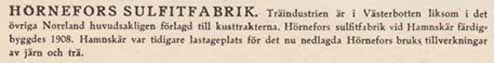 Bild 2. Ett vykort, vars identitet beskrivs i kommande bilder. Vykortet visar Hörnefors Fabrik och dess kontor i förgrunden. Detta är möjligen vid tiden för Axel Edlunds automobilägande, vid början av 1920-talet . Bilen är mikroskopisk och blir suddig i denna förstoring. Det kan vara Frans Kempe eller Carl Kempes bil, eller Axel Edlund som är på besök vid huvudkontoret.