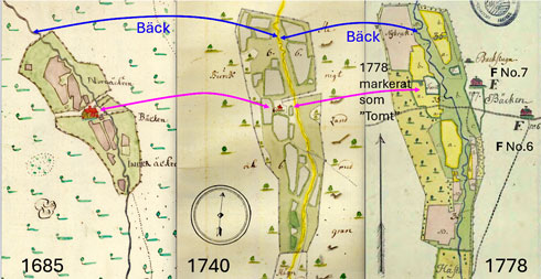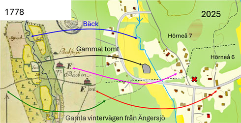 Bild 3. Året 1778 jämförs med 2025. Någon rest av gård eller tomt på den västra sidan av bäcken finns inte. Där finns idag en åker. Skribenten erinrar att det av gamla släktingar pratats om en gammal gård på platsen.